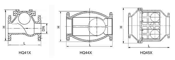 【閥門型號】常見的無磨損球形止回閥型號有HQ41X-10、HQ41X-16、HQ44X-10、HQ44X-16、HQ45X-10、HQ45X-16?!窘Y構示意圖】【安裝示意圖】【外形尺寸】HQ41X